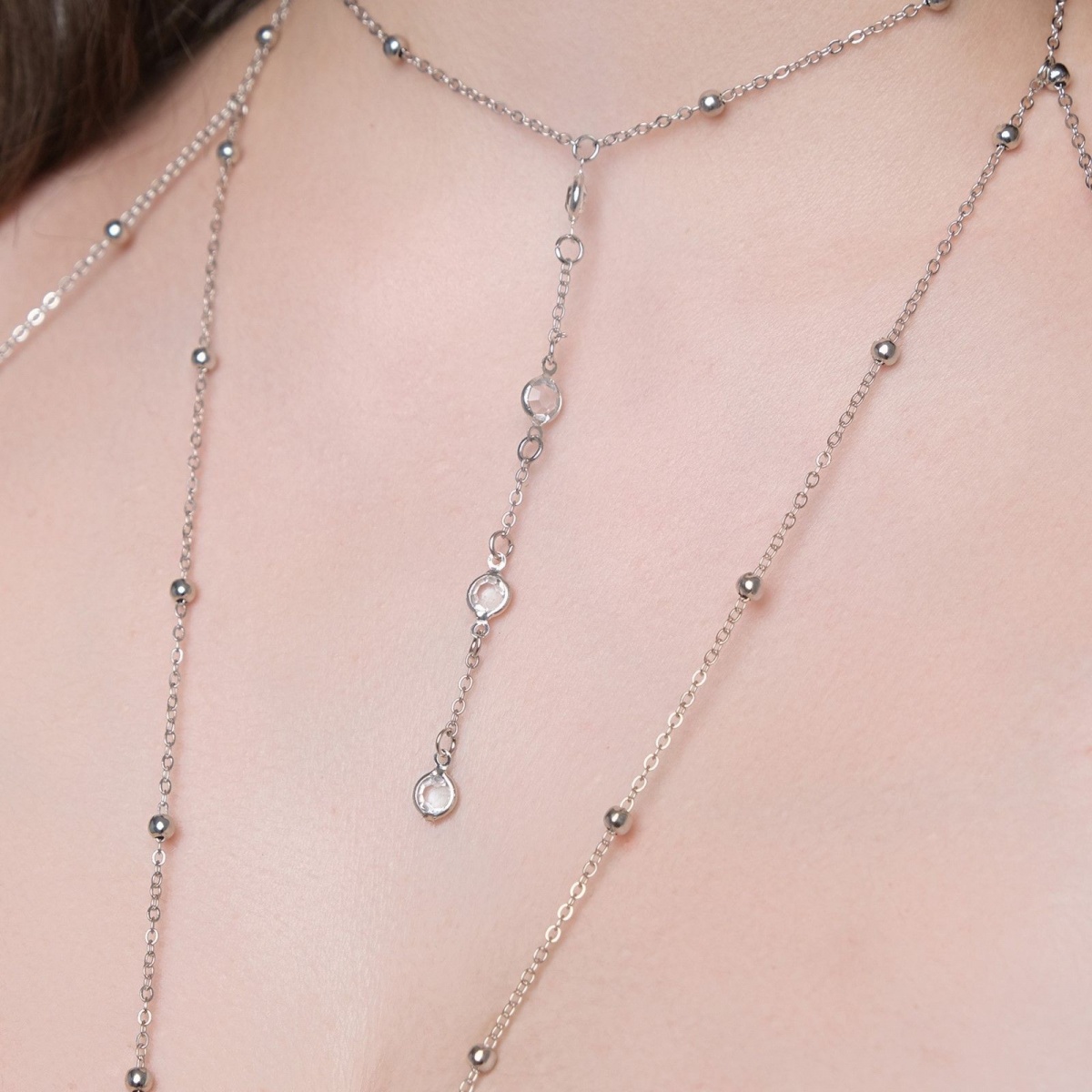 Украшение выполнено из металлических цепочек, оригинально расположенных между собой. Металлические бусинки чередуются с стразами и тонкими колечками на тонкой цепочки.