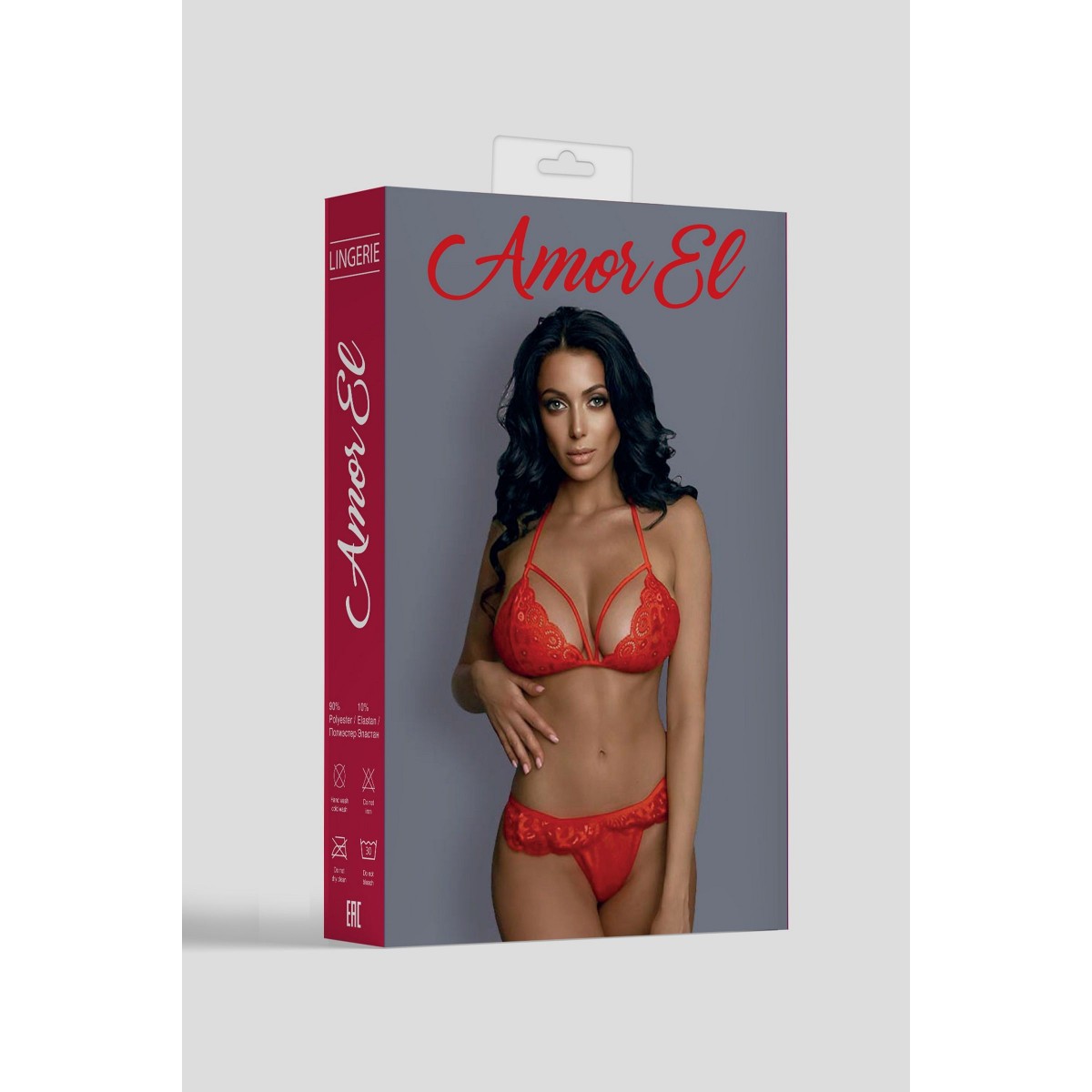 Комплект эротического белья, в который входят кружевной бюстгальтер с бретелями посередине, визуально увеличивающими размер груди, и стринги с ажурным украшением спереди. В комплекте: лиф, трусики-стринги.