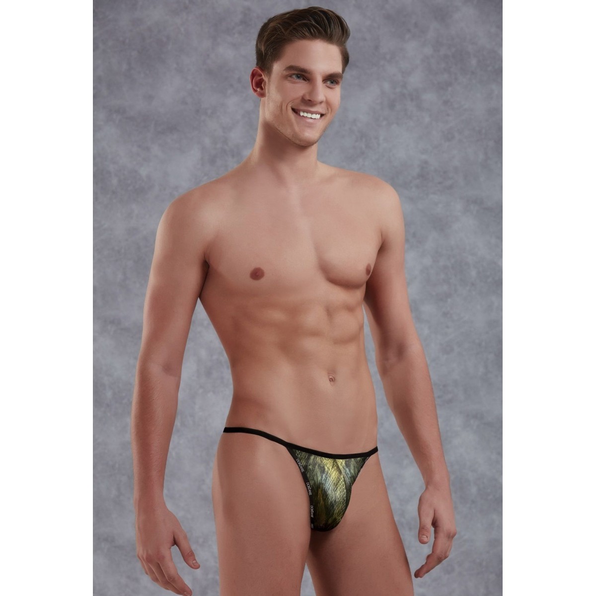 Мужские стринги-ниточки от Doreanse золотисто-зелёного цвета с имитацией кожи рептилий.