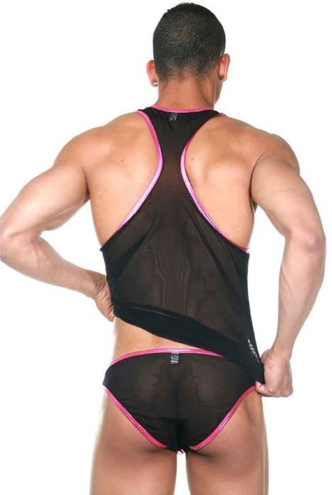 Интересный мужской комплект из майки и трусов-слипов. Майка-борцовка из полупрозрачного материала с контрастной окантовкой. Трусы-слипы из комбинации двух материалов: гладкого блестящего и полупрозрачного цвета. В комплекте: майка, трусы.