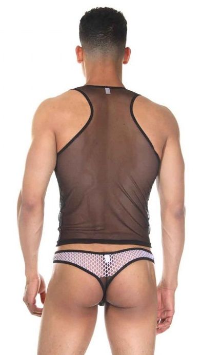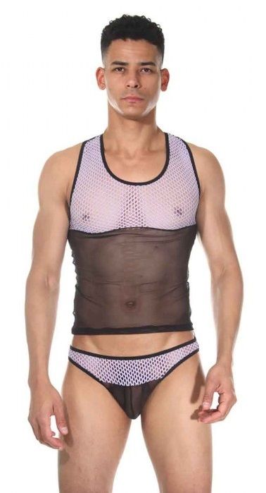 Комплект для мужчин из майки и трусов-тонгов. Сочетаются два материала - полупрозрачная тонкая и крупная сетка. В комплекте: майка, трусы.