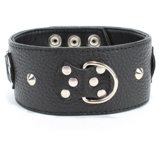 Черный кожаный ошейник с короткими шипами. Имеет три кольца для карабинов, три ряда заклепок-застежек. Размер регулируется. Ширина - 5,4 см.