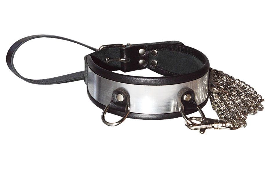 Ошейник изготовлен из высококачественной кожи черного цвета. По краю изделия проходит оторочка, обеспечивающая комфортное использование. Особенностью данной модели является вставка, имитирующая металл, которая придаёт изделию эффектности. Отрегулировать размер ошейника можно при помощи металлической пряжки. Вся металлическая фурнитура имеет никелевое покрытие. Ширина - 4 см. Длина поводка - около 100 см.